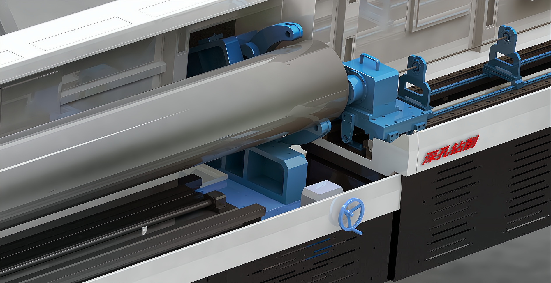 裝夾方式:液壓卡盤(pán)夾持工件左側(cè)外圓,液壓中心架支撐工件右側(cè)外圓,配置腳踩開(kāi)關(guān),工件裝夾便捷可靠,自定心精度高。
