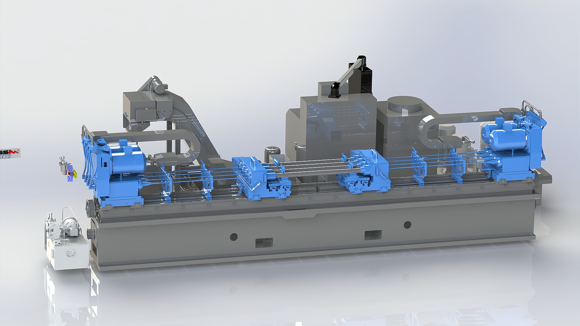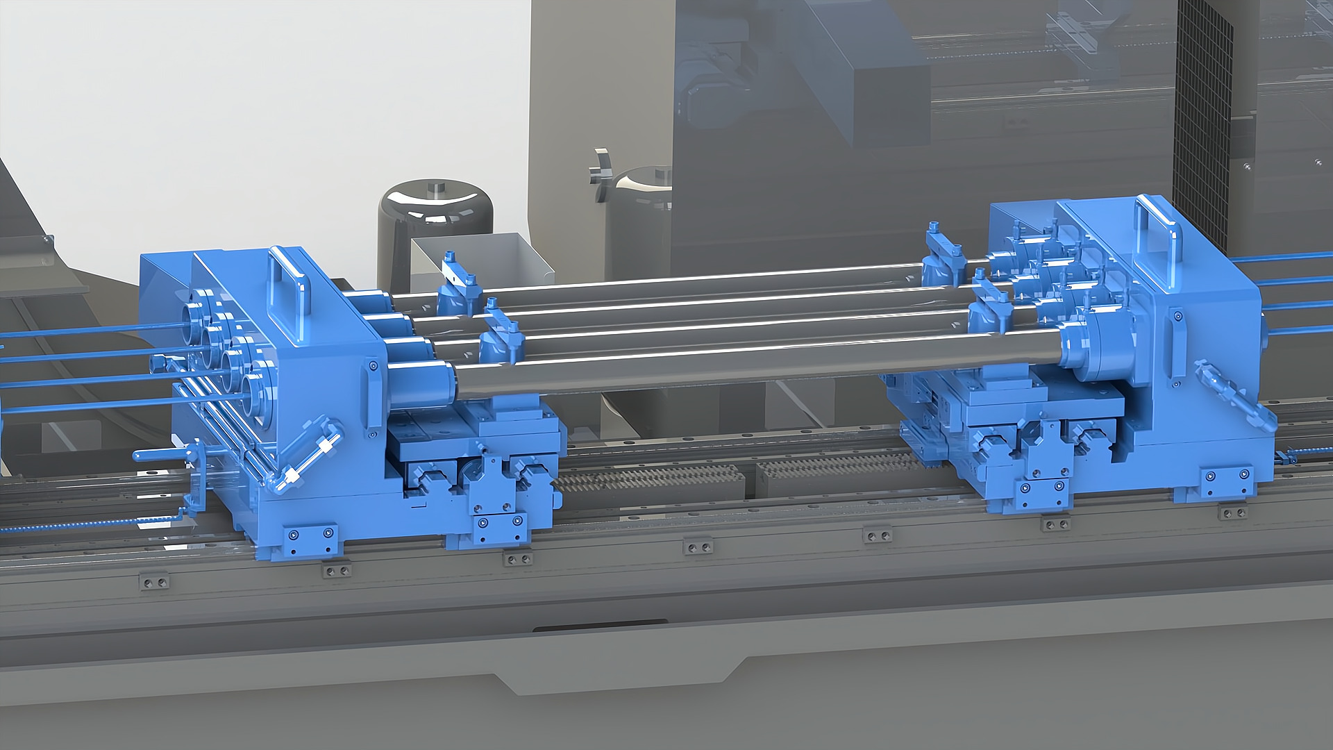 裝夾方式: 機(jī)床配置數(shù)控橫向移動工作臺;工件采用“V”型鐵支撐工件外圓,液壓旋轉(zhuǎn)壓板自動夾緊工件;一次裝夾,可以完成多個孔位的深孔加工;