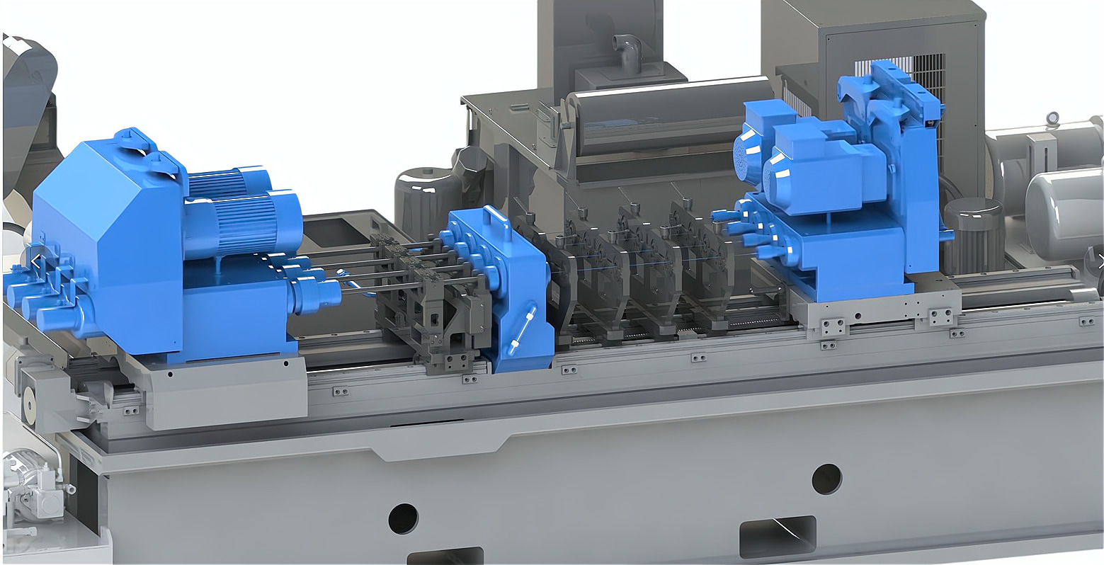 裝夾方式:采用液壓筒夾+液壓中心架,夾持工件兩端外圓,定位精度高,裝夾便捷,需用輔具少